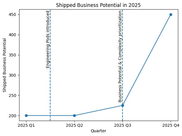 We have introduced Engineering Pods (with project ownership) and Just-in-Time (JIT) project planning at the end of Q1 2025. As can be seen from the graph it initially had little to no impact. This is not entirely true, as we have experienced unusually high operational load during Q2 (we had more than usual issues with data integrations and CS related requests). Having delivered the same amount of Business Potential during that time is a win in my book. We then increased value delivered by around 10% in Q3, which is also mostly summer, vacation period. The signs were there all along that the new way of working was indeed effective.